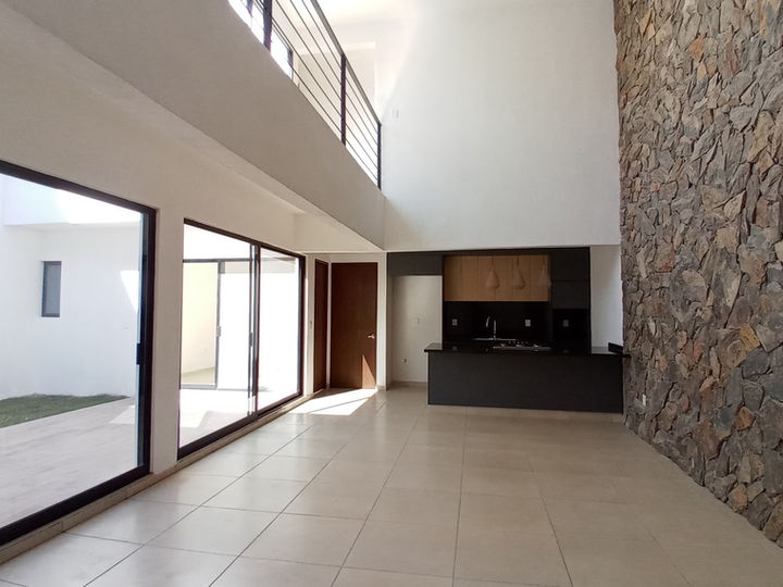 Casa de dos plantas, vestíbulo, 4 recámaras, sala y comedor a doble altura con muro de piedra laja, cocina integral con cubierta de granito, 3 1/2 baños, cuarto de lavado, terraza con piso tipo madera, pequeño jardín. Estacionamiento techado para 2 autos.