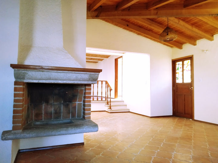 Casa de una planta, 2 recámaras (la principal con vestidor), 2 baños, sala de T.V., sala con chimenea, comedor, cocina integral con cubierta de granito, área de lavado, patio posterior, terraza, asador y jardín. Estacionamiento para 2 autos.